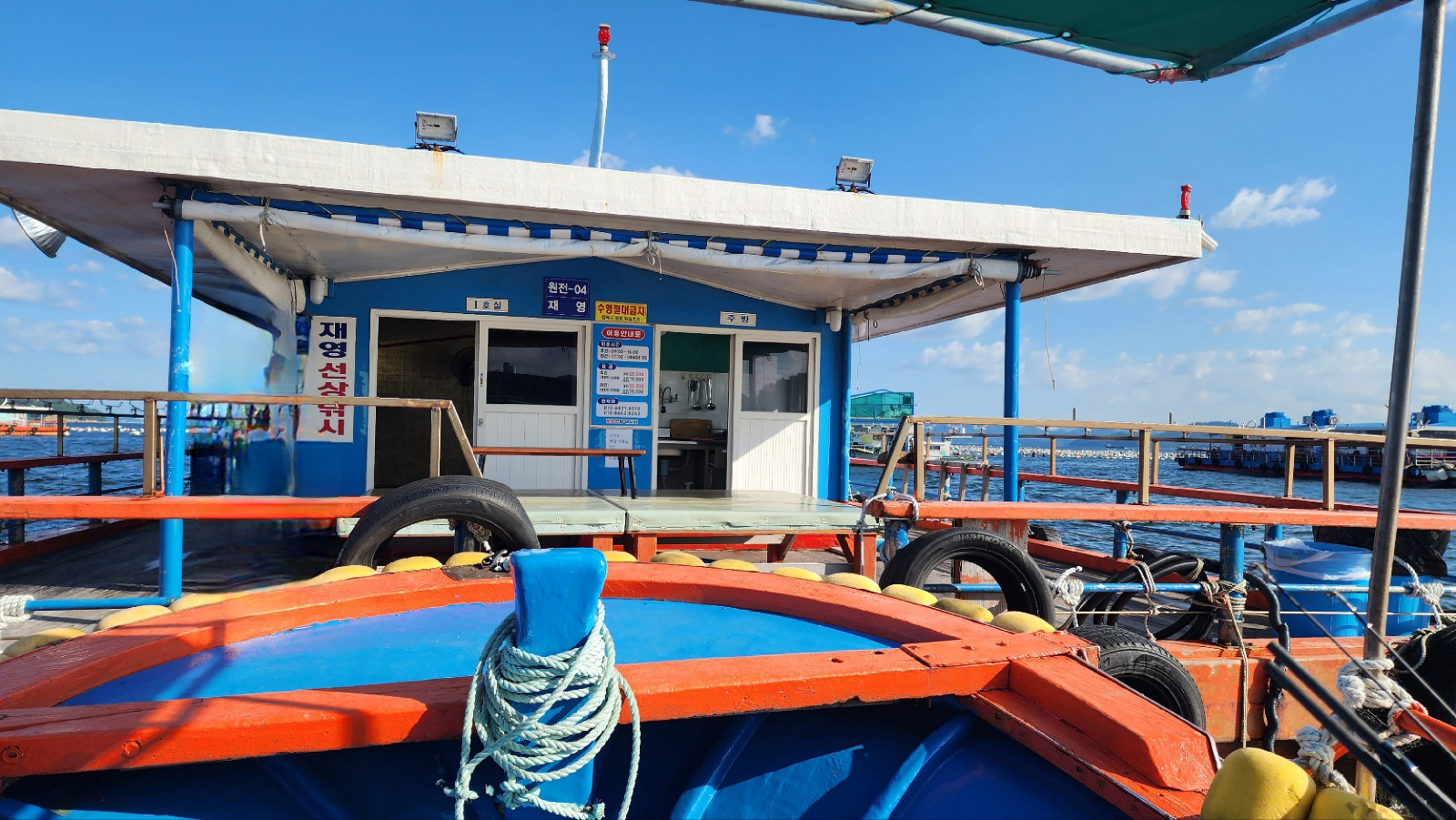 재영좌대는 마산 원전 해상콘도와 거의 동일한 구조로 방 2개, 화장실 1개로 되어 있고 가스레인지, 전자레인지, 밥솥, 식기류, 선풍기, 에어컨, 난방시설, 침구류, 텔레비전 등 거의 모든 것이 갖춰져 있습니다. 시설도 깨끗하고 좌대 주변도 깔끔하게 정리되어 있었는데 특히 화장실이 여름인데도 불구하고 깔끔하고 불쾌한 냄새가 안 나는 게 가장 좋았습니다.