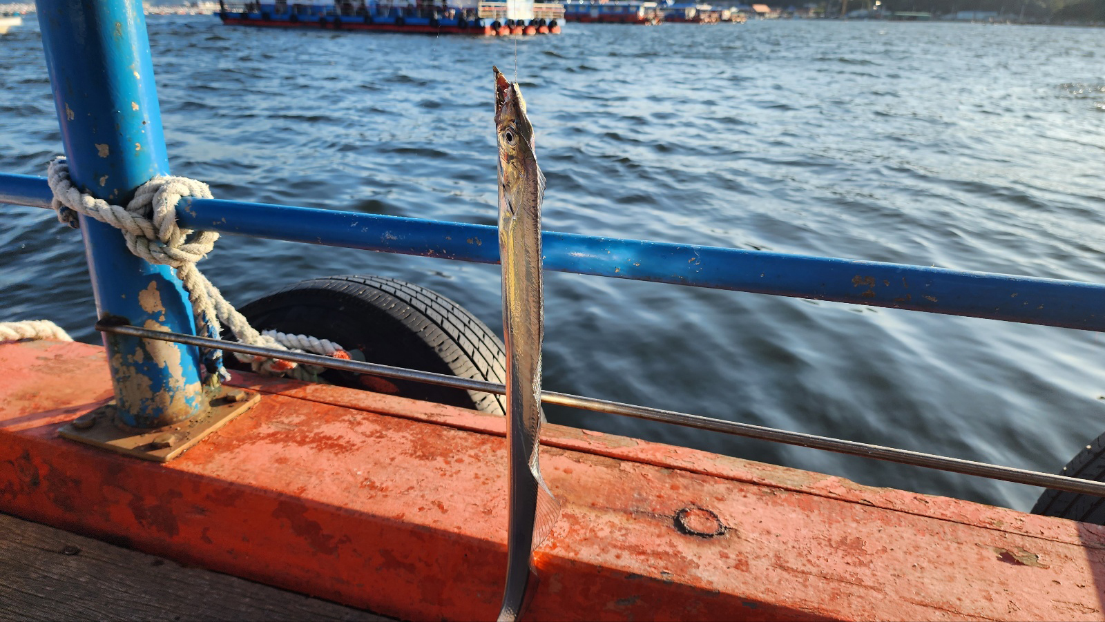 이날 물때는 조금이었는데 바람이 엄청 불어서 수면은 물이 잘 가는 것처럼 보였으나 실제는 물이 거의 흐르지 않았습니다. 갈치 첫 수는 4시 30분쯤 올렸는데 그때부터 2시간 정도 잘 잡히다가 그 이후부터는 뜨문뜨문 잡히고 정작 잘 잡힐 것 같았던 밤에는 입질이 뚝 끊겨서 그냥 쉬었던 거 같네요. 새벽에는 어쩌다 한 마리씩 잡히고 전체 40수 정도하고 7시 넘어서 철수했습니다. 갈치 크기는 2~3지 정도인데 아직까지는 2~2.5지가 잡힙니다. 고등어와 전갱이는 낮은 수심층에서 간간히 잡혔습니다.