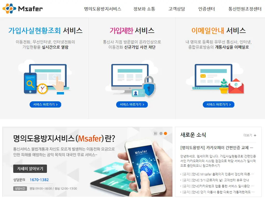 한국정보통신진흥원에서 서비스하는 것으로 신규 휴대폰, 인터넷, 인터넷전화, 유선전화등이 본인명의로 신규가입 또는 본인 명의로 양도될 경우 SMS로 알려주는 서비스입니다. 그 외 엠세이퍼는 현재 가입현황조회와 명의도용 가입제한 서비스를 통해 무료로 명의도용방지를 지원해주고 있습니다.
