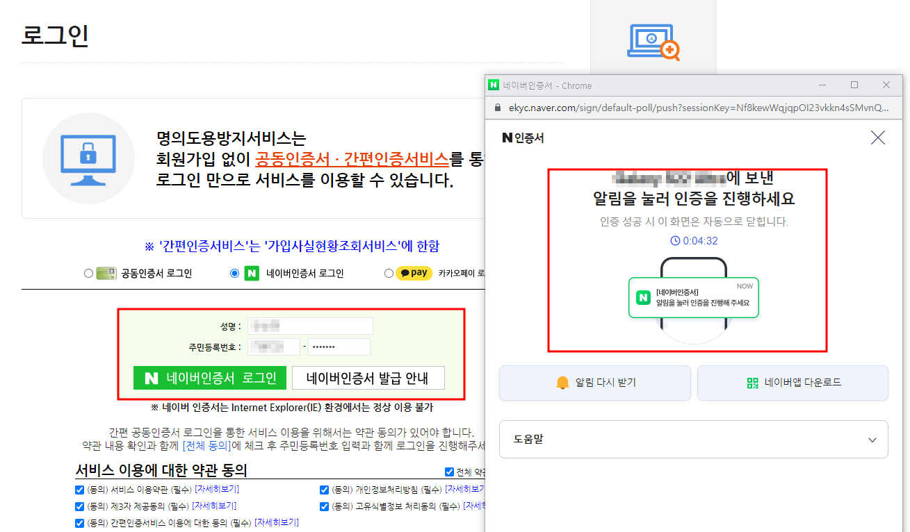 - 네이버인증서를 클릭하고 이름과 주민등록번호를 적고 전체동의를 체크한 뒤 '네이버인증서 로그인'을 클릭합니다.