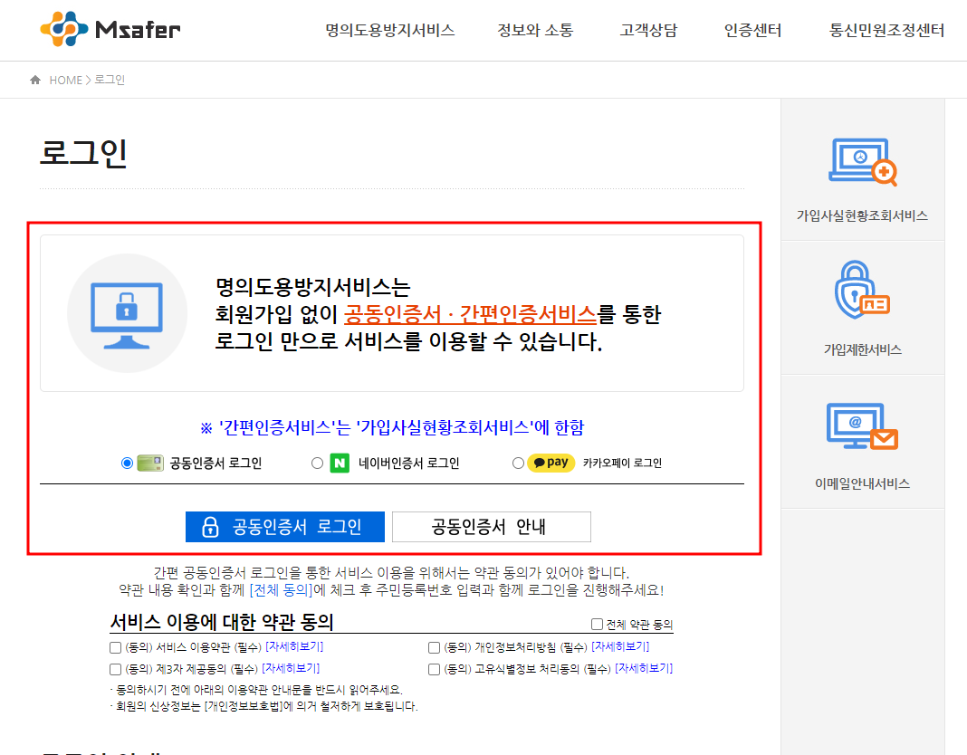통신사 방문 없이 통신사 신규가입을 차단할 수 있는 서비스입니다. 가입제한서비스는 간편 인증으로는 서비스가 안되고 공동인증서가 있어야 가입제한 서비스 이용이 가능합니다.