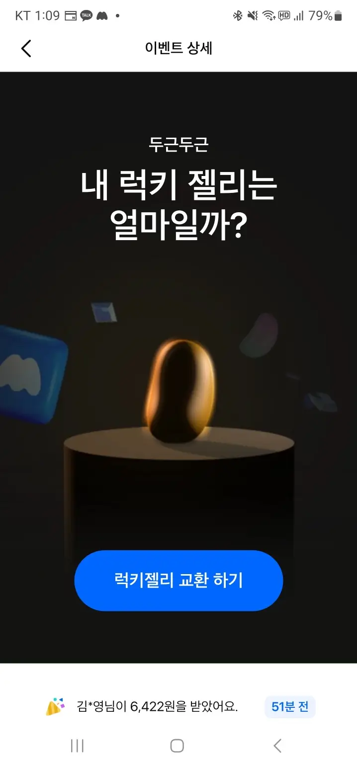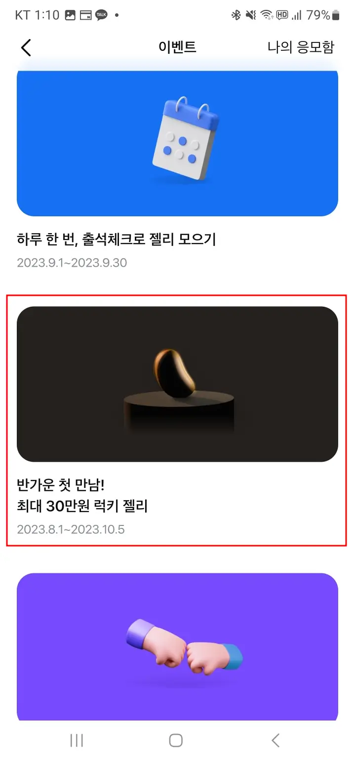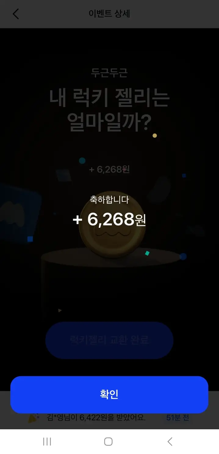 이제 내 럭키젤리가 얼마인지 알아보겠습니다. 앱하단에 혜택을 클릭하고 '이벤트 모두 보기'를 누릅니다. 럭키젤리를 클릭 후 금액을 수령하면 됩니다. 저는 안타깝게 6,268원이네요. 어떤 분은 37,769원을 받으셨습니다. 좀 부럽네요. 2023. 8. 1 ~ 10. 5까지니까 기간 놓치지 말고 꼭 받아보세요.
